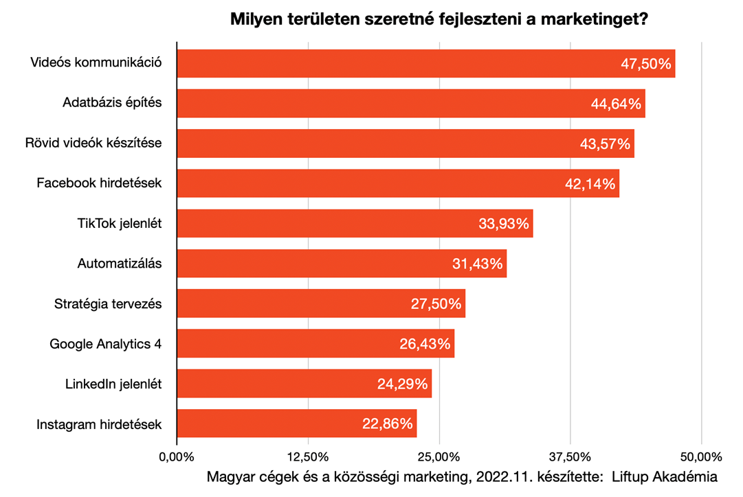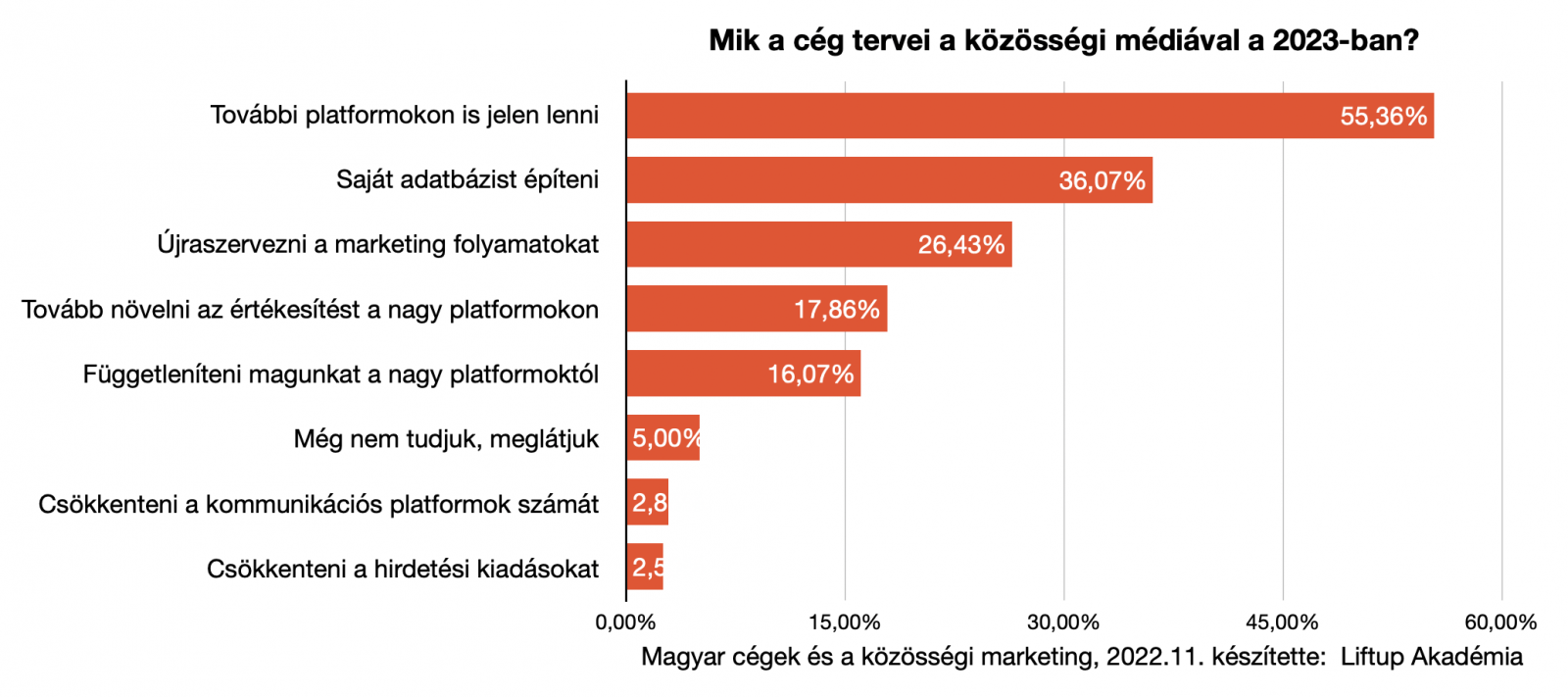 A válaszadók 55,36%-a még több platformon szeretne jelen lenni, 36,07%-uk pedig a saját adatbázisát szeretné növelni. Ezek mindegyike segíthet abban, hogy ne legyen kitéve egy vállalkozás egyetlen platform (jellemzően a Facebook) változásainak.