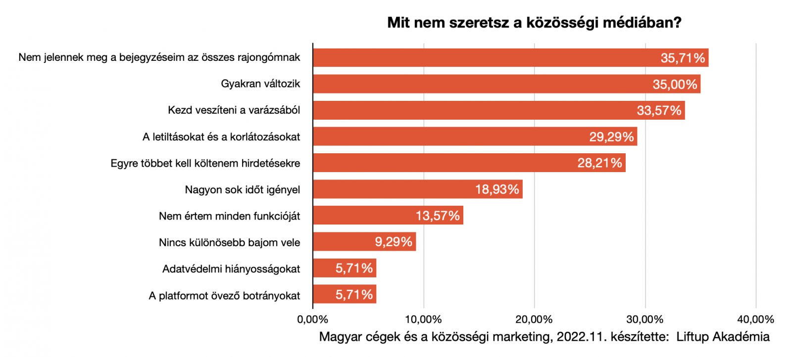 Ma már ezek aránya csökkent, hiszen arra a kérdésre, hogy mit nem szeretnek a közösségi médiában, már csak 35,7%-a válaszolta azt, hogy „Nem jelennek meg a bejegyzéseim az összes rajongómnak”. Ez ugyan az első helyen volt, de ugyanezt a lehetőséget tavaly még a válaszadók közel 50%-a jelölte meg, korábban pedig még magasabb volt az arány.