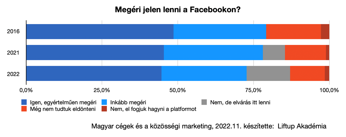 A Facebook a legfontosabb marketing platform a kisvállalkozások nagy részének, és a válaszadók szerint még mindig megéri, hiszen 2022-ben is 72,7% mondta azt, hogy megéri jelen lenni a felületen. Azonban az elégedettek aránya csökken, az elégedetleneké pedig folyamatosan növekszik az előző évekhez képest.