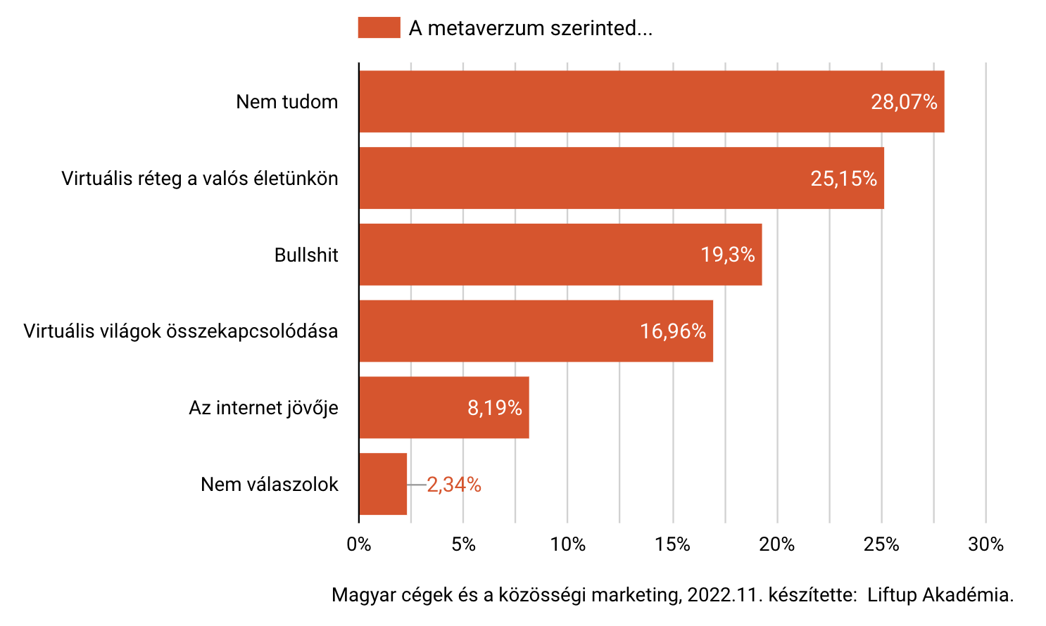 A válaszadók még nem érzik elérkezettnek az időt arra, hogy a metaverzumot használják. Sokan nem is tudják mi az, vagy egyszerűen egy felesleges, kitalált témának gondolják.