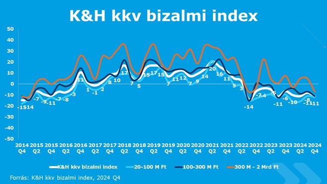 A Magyar Marketing Szövetség vállalati tagja, a K&H kkv bizalmi index 2024 utolsó negyedéves kutatási adatai alapján mérsékelt rosszkedv érzékelhető a magyar kkv vezetőkön. A mutató jelenleg -11 ponton áll, ami a nyári szintnek felel meg. Leginkább a legnagyobb, 300 millió és kétmilliárd forint közötti árbevételű cégvezetők körében érezhető a hangulatváltás: az ő esetükben az elmúlt negyedév 5 pontjáról -7-re süllyedt a mutató, ami jelentős, 12 pontos beesést jelent.