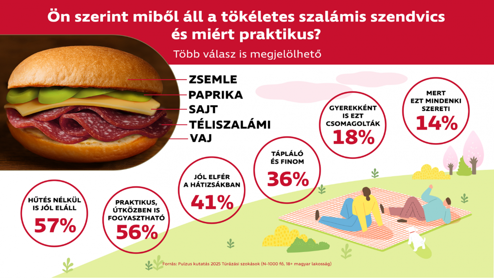 Nem meglepő, hogy a felmérés szerint a magyarok kedvenc túrelemózsiája a szalámis szendvics (79%), hiszen a fenti elvárásoknak tökéletesen megfelel. Nem mindegy azonban, hogy milyen! A kutatásból kiderült: a legtöbben zsemle, téliszalámi, sajt, paprika és vaj összeállításban készítik el a kirándulós szendvicsüket.