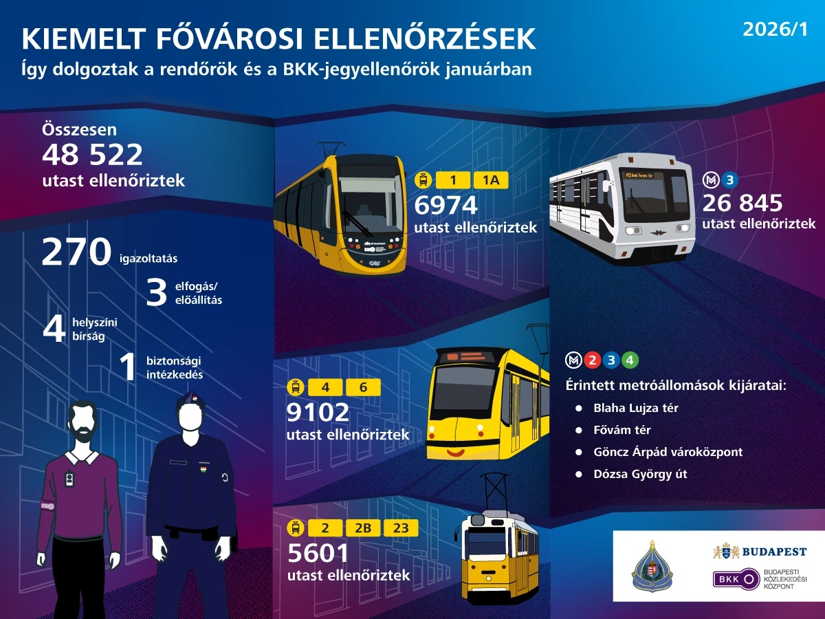 Idén is rendszeresek a fokozott rendőri és jegyellenőri jelenléttel végzett járatellenőrzések Budapesten. A Budapesti Rendőr-főkapitányság (BRFK) és a Magyar Marketing Szövetség vállalati tagja, a Budapesti Közlekedési Központ (BKK) munkatársai a FÖRI-rendészekkel együttműködve januárban nyolc járaton több mint 48 ezer utast ellenőriztek. Az akciók során a megállókat, állomásokat és azok környezetét is vizsgálták. A cél a közösségi közlekedést használók biztonságérzetének növelése.