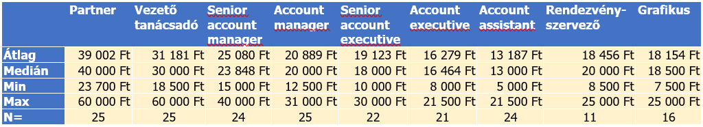 Az MPRSZ első hazai PR-ügynökségi óradíjfelmérésének főbb eredményei: