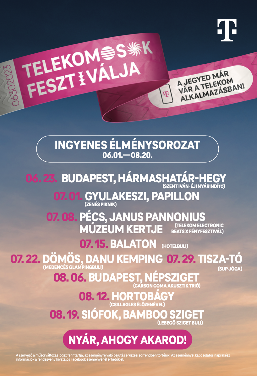A Magyar Telekom az anyavállalatával, a Deutsche Telekommal közösen kifejezetten a fiatalok számára további élményekkel is készül. Az elmúlt évek folyamatos krízisei, a növekvő gazdasági, környezeti és társadalmi nyomás miatt ez a korosztály nem tudja úgy megélni a fiatalságát, ahogy az a korábbi generációknak megadatott. Ebben igyekszik segíteni a Telekom, ezért a nyár folyamán az egyes országok – így Magyarország – Z generációsai között 11 európai fesztiválra sorsol ki belépőjegyeket. Azok a fiatalok pedig, akik nem bíznák a szerencsére a nyári bulikat, jelentkezhetnek a Magyar Telekom Fesztivál Kreátor programjába, amelyben június 13-ig olyan fiatalokat toboroznak, akik szeretnének ingyen eljutni az idei év legmenőbb rendezvényeire, fesztiváljaira és végigbulizni a nyarat, cserébe pedig szívesen tudósítanak, készítenek tartalmakat ezekről az élményeikről.