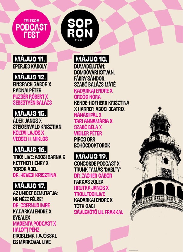 „Hol a boldogság mostanában?” – így szól Tari Annamária legutóbbi könyve, amelyben a mesterséges intelligencia, a digitális világ okozta kihívásokat elemzi. A Soproni Egyetemen megrendezett beszélgetésen a szerző mellett Nánási Pál, Szabó Béla és Weiler Péter vesz részt. A Semmelweis film kapcsán a rendező, Koltai Lajos és a főszereplő, Vecsei H. Miklós érkezik a Hűség Városába. A Magenta Podcast vendége pedig a SopronFest exkluzív fellépője, a Halott Pénz lesz.