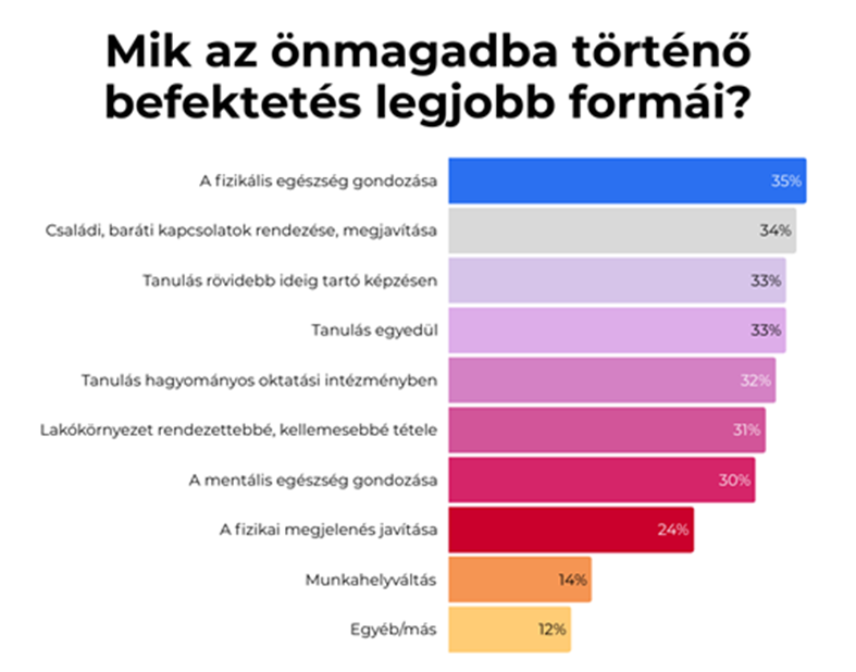 Az Erste arra is kíváncsi volt, a munkavállalók mennyire tartják fontosnak önmaguk fejlesztését, mit tesznek meg ennek érdekében, illetve kire, mire számítanak ebben, milyen támogatásra van szükségük. A felmérésben több választ is meg lehetett jelölni. A válaszok alapján a magyarok a fizikai egészségük gondozását (35 százalék), ideértve például a szűrővizsgálatokon való részvételt tartják a legjobb befektetésnek személyes fejlődésük szempontjából. Ettől alig lemaradva a családi, baráti kapcsolatok rendezése (34 százalék), a rövidebb képzések elvégzése (33 százalék), az autodidakta módon történő tanulás (33 százalék), a hagyományos oktatási intézményben történő tanulás (32 százalék), a lakókörnyezet rendezettebbé, kellemesebbé tétele (31 százalék), és a mentális egészség gondozása (30 százalék) követi. A tanulásnak egyébként a 30-39 év közöttiek tulajdonítják a legnagyobb jelentőséget, minden formáját 40 százalék feletti arányban jelölték meg, míg a diplomások általánosságban több önfejlesztési módszert is pozitívan ítélnek meg.