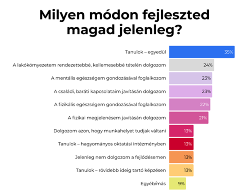 Személyes fejlődésük érdekében jelenleg a legtöbben egyedül tanulnak (35 százalék), a lakókörnyezetüket rendezik (24 százalék), társas kapcsolataik fejlesztésén dolgoznak (23 százalék), a mentális egészségüket gondozzák (23 százalék), a fizikai egészségükkel foglalkoznak (22 százalék), vagy a megjelenésük javításán fáradoznak (21 százalék). A munkavállalók mindössze 13 százaléka nyilatkozott úgy, hogy jelenleg nem dolgozik a saját fejlődésén. A fiatalok (16-29 év közöttiek) jelentősen magasabb arányban (32 százalék) foglalkoznak a mentális egészség gondozásával, míg a 60 év felettiek a fizikális egészségre fordítanak nagyobb figyelmet az átlagnál (28 százalék).