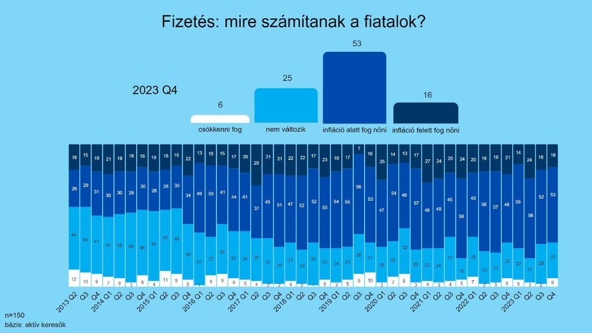 A fiatalok többsége tehát optimista a fizetésemelést tekintve, ugyanakkor a korábbi negyedévekhez képest kicsit árnyaltabb a kép. 2022 utolsó negyedévében szintén 69 százalékos volt az optimisták aránya, ugyanakkor 2023 első és második negyedévében 73, illetve 80 százalékos eredmények születtek. Utóbbiakhoz képest minimálisan csökkent a derűlátó dolgozó fiatalok aránya. A friss eredményekből látható az is, hogy 25 százalékuk stagnálásra, azaz a mostani fizetésére számít minden hónapban. Mindössze 6 százalékuk tartja reálisnak, hogy a mostaninál kisebb összeggel kell beérnie.