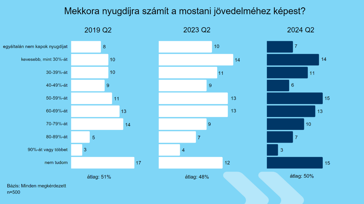 A K&H negyedévről negyedévre ismétlődő felmérései szerint nem változnak érdemben a nyugdíjak mértékével kapcsolatos várakozások. Minél idősebb valaki, annál bizakodóbb, azaz fizetésének annál nagyobb arányát reméli megkapni havonta. A felmérés szerint a válaszadók átlagosan 50 százalékra számítanak a jelenlegi fizetésükhöz képest. A falvakban élők pesszimistábbak, ők arra számítanak, hogy a jövedelmüknek csak a 44 százalékához jutnak hozzá. A megkérdezettek 7 százaléka semmilyen ellátásra nem számít. Az 50 százalékos arány egyébként nem jelent lényeges változást a tavalyi és a járvány előtti – 2019-es – eredményekhez képest sem. Tehát évek óta stabil azoknak a tábora, akik a jelenlegi fizetésük felére számítanak nyugdíjasként.