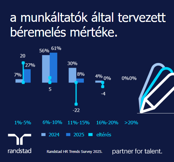 2025-ben a válaszadók 96%-a tervezi megemelni munkavállalóinak fizetését, azonban a csökkentő infláció mellett a munkaadók által tervezett béremelések dinaminkája jelentősen lassul. 15%-nál nagyobb fizetésemeléssel senki sem tervez: a cégek 61%-ánál 6-10%-os fizetésemelés van kilátásban, több mint negyedük 1-5%-os emeléssel tervez és idén már csupán 8% kíván eszközölni 11-15%-os emelést a tehetségek bevonzása és megtartása érdekében (többek között a FMCG szektor válaszadóinak 21%-a, az ipari gyártásban tevékenykedők 13%-a vagy az ingatlan / építőipari vállalatok 12%-a).
