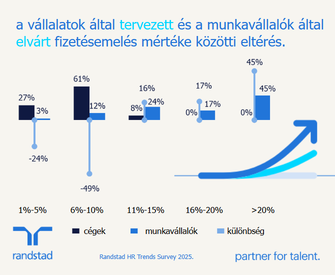 A Randstad Hungary social media felméréséből azonban kiderült, hogy ezek a mértékű béremelési tervek elmaradnak a munkavállalók várakozásaihoz képest, ők nagyobb léptékű fizetésemelést tartanak reálisnak a jelenlegi piaci helyzetben, az elvárásaik pedig egyre nőnek. A munkavállalók majdnem fele (45%, tavalyhoz képest +20%) több mint 20%-os emelést szeretne, de a megkérdezett cégek egyike sem tervez ezzel.