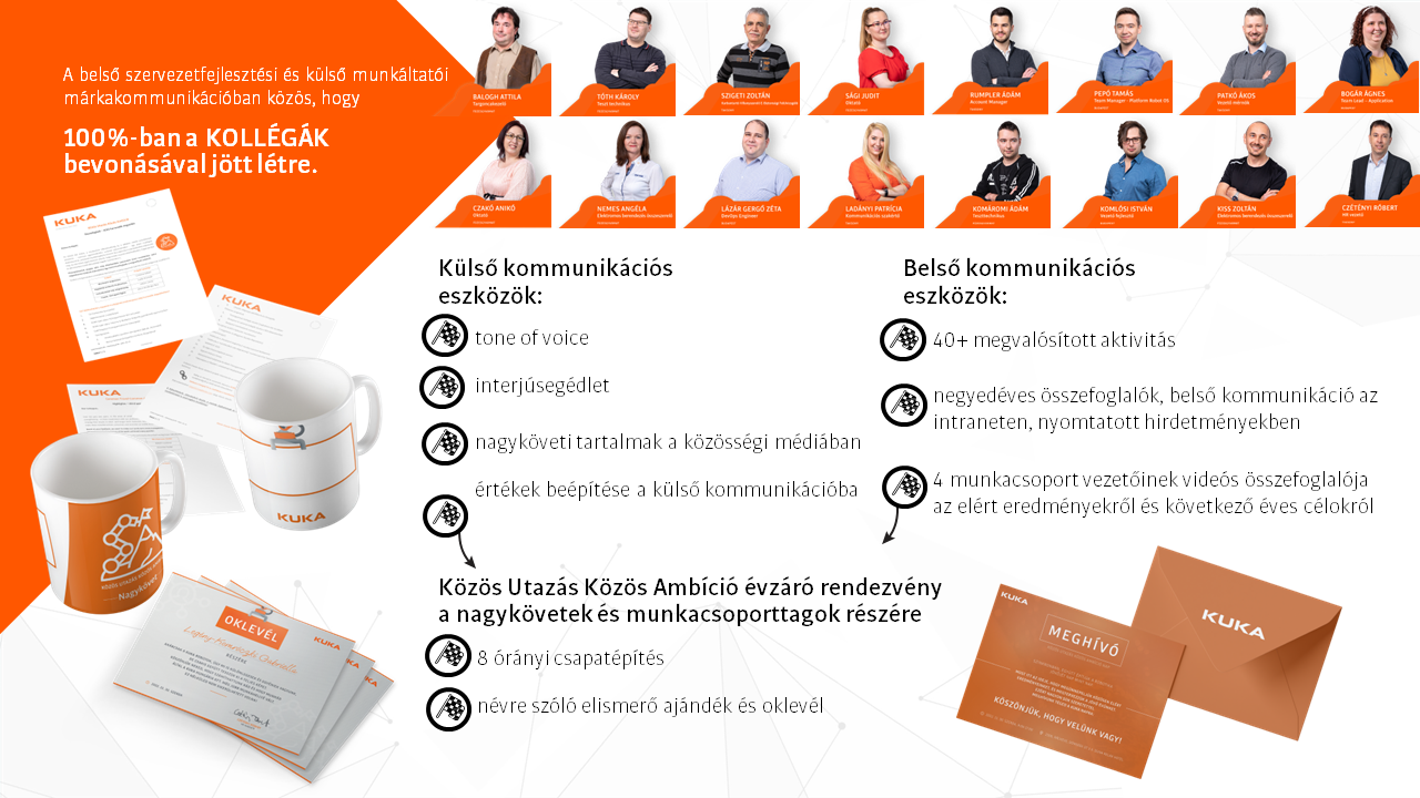 A mára már közel 40 fős nagyköveti közösségünk mellett elindult egy olyan program, amely a kollégák 100%-os közreműködésével fókuszál négy fő területre a szervezeten belül: Megfelelő emberek kiválasztása-, Csapat és támogató légkör-, Juttatásokkal való elégedettség-, és Megtartás munkacsoport. A négy munkacsoport 4 vezető bevonásával, több mint 50 kolléga részvételével működik, hogy a KUKA egyre jobb munkahellyé váljon.