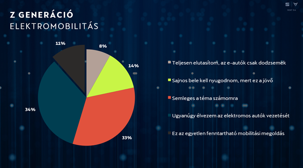 Az e-mobilitás témája már jóval megosztóbb. A fiatalok egyharmada élvezi ugyanúgy az elektromos autók vezetését, mint a belső égésűekét, és szintén egyharmaduk számára semleges a téma. Míg 11,5%-uk vallja magát környezettudatosnak, és emiatt választana e-autót, addig 8%-uk teljesen elutasítja ezt a mobilitási alternatívát.