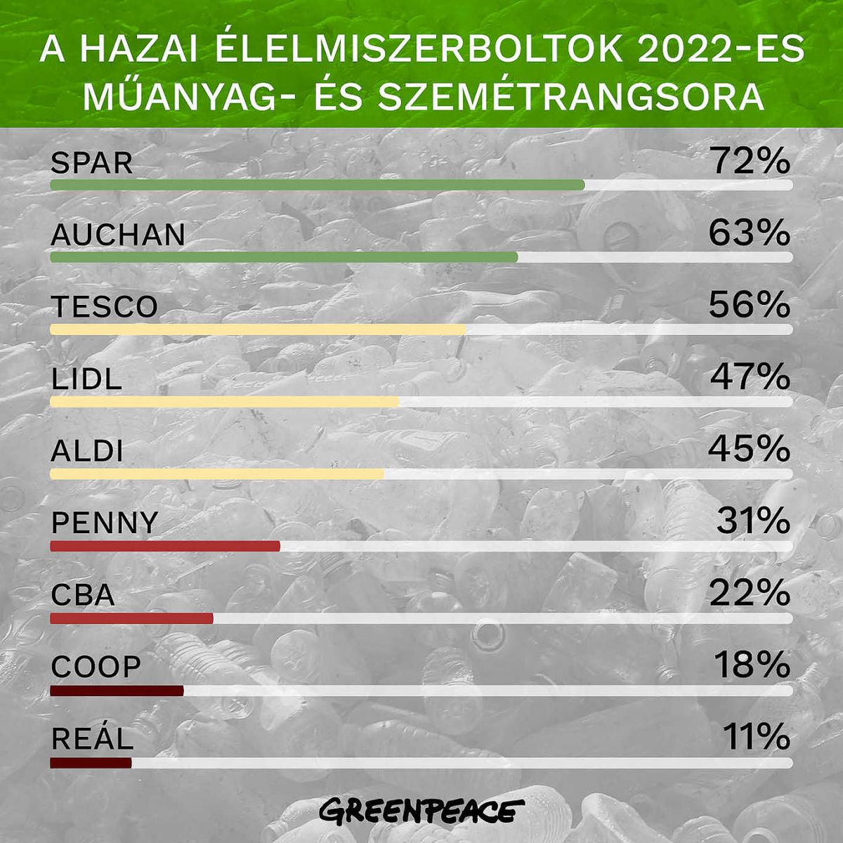 Az élelmiszerláncok rangsora a következőképpen alakult a 2022-es felmérésben. A Magyar Marketing Szövetség három tagja - a SPAR, az Auchan és a Tesco - végzett az első három helyen. Őket követte a Lidl, az ALDI, a PENNY, a CBA, a Coop, az utolsó helyezést a Reál érte el. A Greenpeace közlése szerint a CBA, a Coop és a Reál értékelését megnehezítette, hogy ezek a láncok egyáltalán nem reagáltak a megkeresésükre, ezért őket csak a szervezet aktivistáinak helyszíni felmérése alapján tudták rangsorolni. Aki a részletes eredményekre kíváncsi, az a Greenpeace teljes kutatási jelentését is végiglapozhatja.