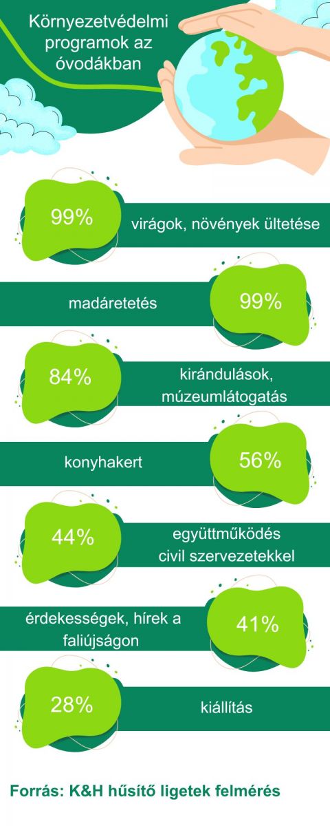 Az intézmények közül többen hangsúlyozták, hogy minden nap foglalkoznak a természet megismerésével és védelmével, így az élővilág tisztelete észrevétlenül beépül a gyermekek értékrendjébe. Szinte az összes megkérdezett óvodában (98%) etetik a madarakat az udvarra tett etetőkben, szintén 98 százalék együtt ültet a kicsikkel virágot, amelyekről később a gyermekek gondoskodnak, az óvodák több mint a felében (56%) pedig konyhakertet is gondoznak az ovisok. A K&H hűsítő ligetek jóvoltából fák és bokrok elültetésében és növekedésük segítésében is részt vehetnek, hiszen a programnak köszönhetően 100 köznevelési intézményben összesen 555 fa és 1110 cserje zöldíti udvarokat. Így a gyerekek már egészen kicsi korukban felelősek lesznek élőlényekért, növényekért, a velük való törődés pedig erősíti bennük azt, hogy fontos a természet megóvása.