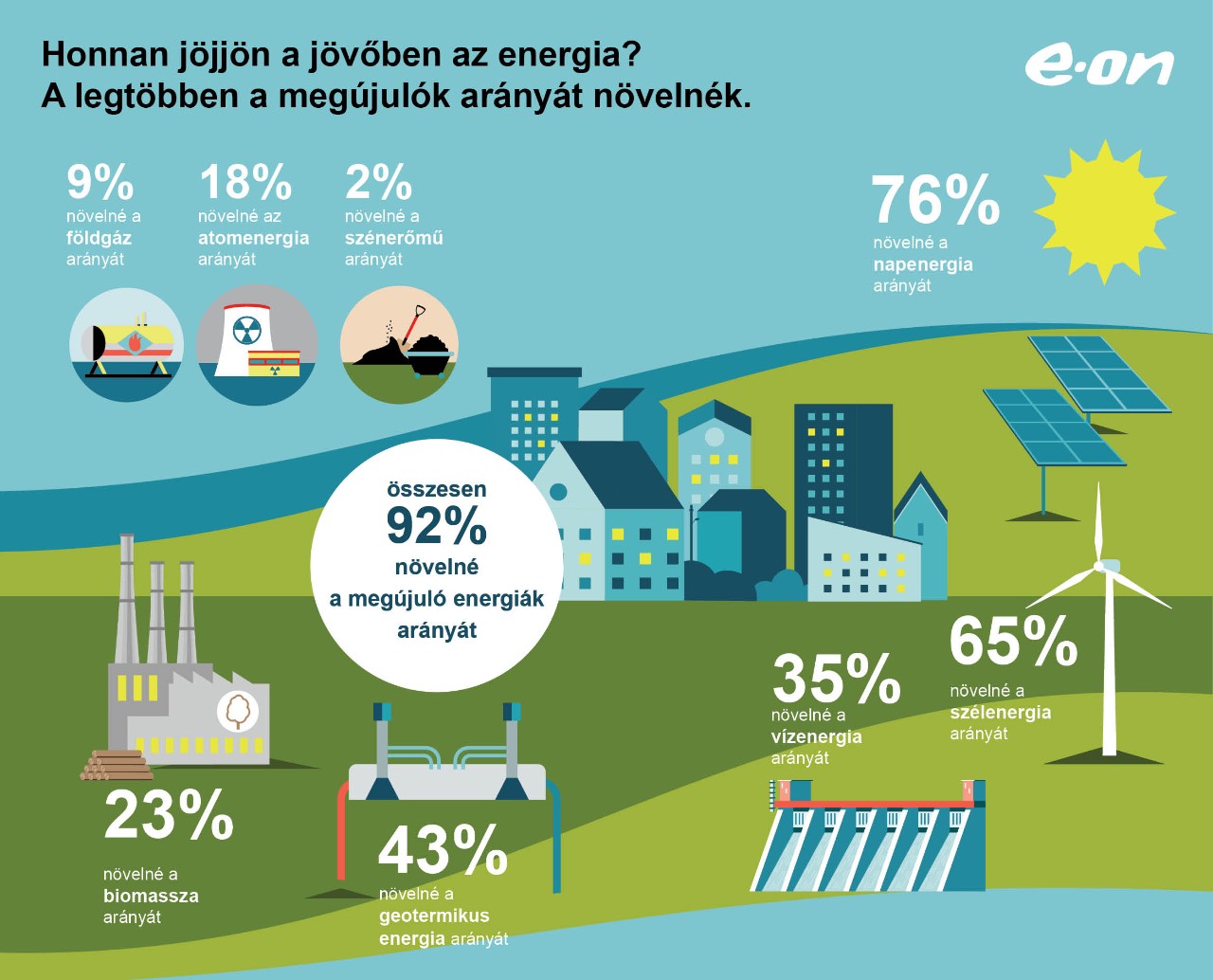 A Magyar Marketing Szövetség vállalati tagja, az E.ON nemrég végzett országos kutatásának egyértelmű tapasztalata, hogy a válaszadók a jövőre nézve azt szeretnék, hogy markánsan nőjön a zöldenergia, mindenekelőtt a nap- és a szélenergia részaránya. A megújulók szerepének növelését a kérdezettek 92 százaléka, ezen belül a napenergia fokozottabb térnyerését 76, a szélenergiáét a válaszadók 65 százaléka tartja fontosnak.