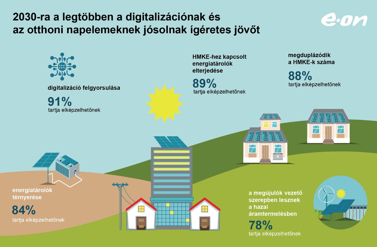 A kutatás eredménye szerint, ha a nem túl távoli jövőbe tekintünk, a legtöbben (84%) valószínűnek tartják, hogy 2030-ra a jövő hálózata az energiatárolásban is többet nyújt majd. Továbbra is jelentős szerepet tulajdonítanak a háztartási méretű kiserőművek térnyerésének (88%) és ennél is többen (89%) gondolják, hogy az energiatárolás az otthoni napelemek közelében, vagyis a háztartásokban valósul majd meg. A legbiztosabb fejlődési iránynak ugyanakkor a digitalizációt (91%) várják a kutatás résztvevői.